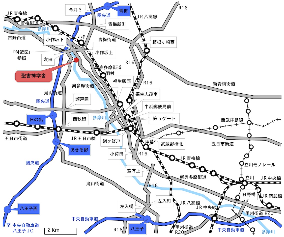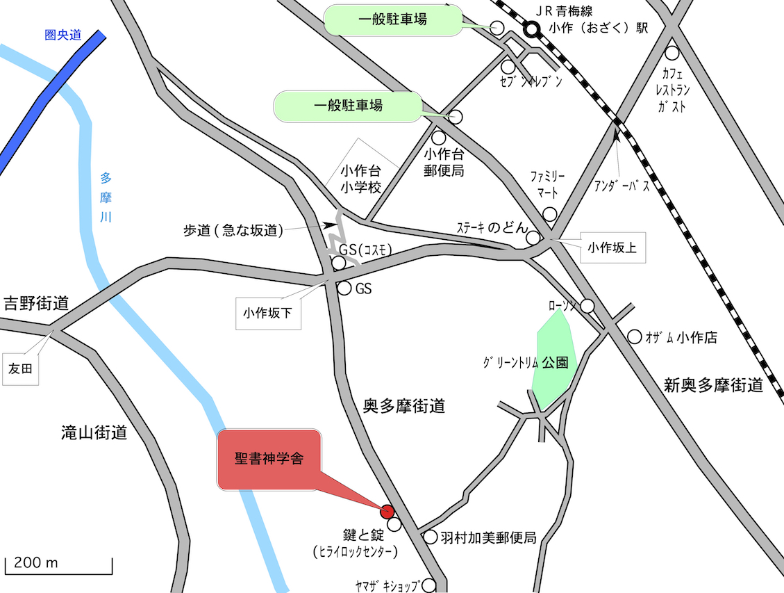 聖書神学舎は小作駅西口から徒歩15~20分、奥多摩街道沿いにあります(下の地図参照)。タクシー(初乗り料金で到着)も利用できます。