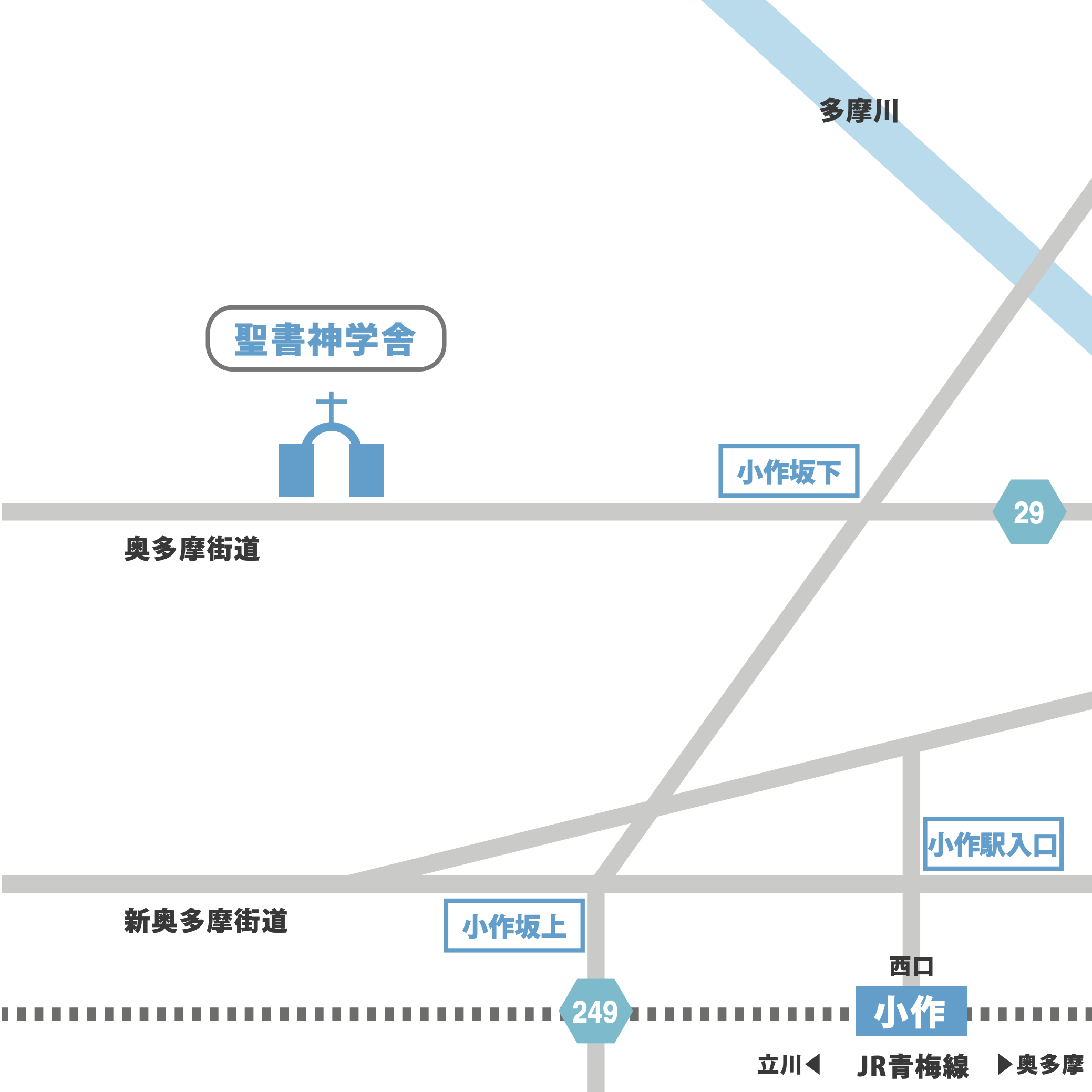 聖書神学舎の最寄り駅は、JR青梅(おうめ)線の小作(おざく)駅です。